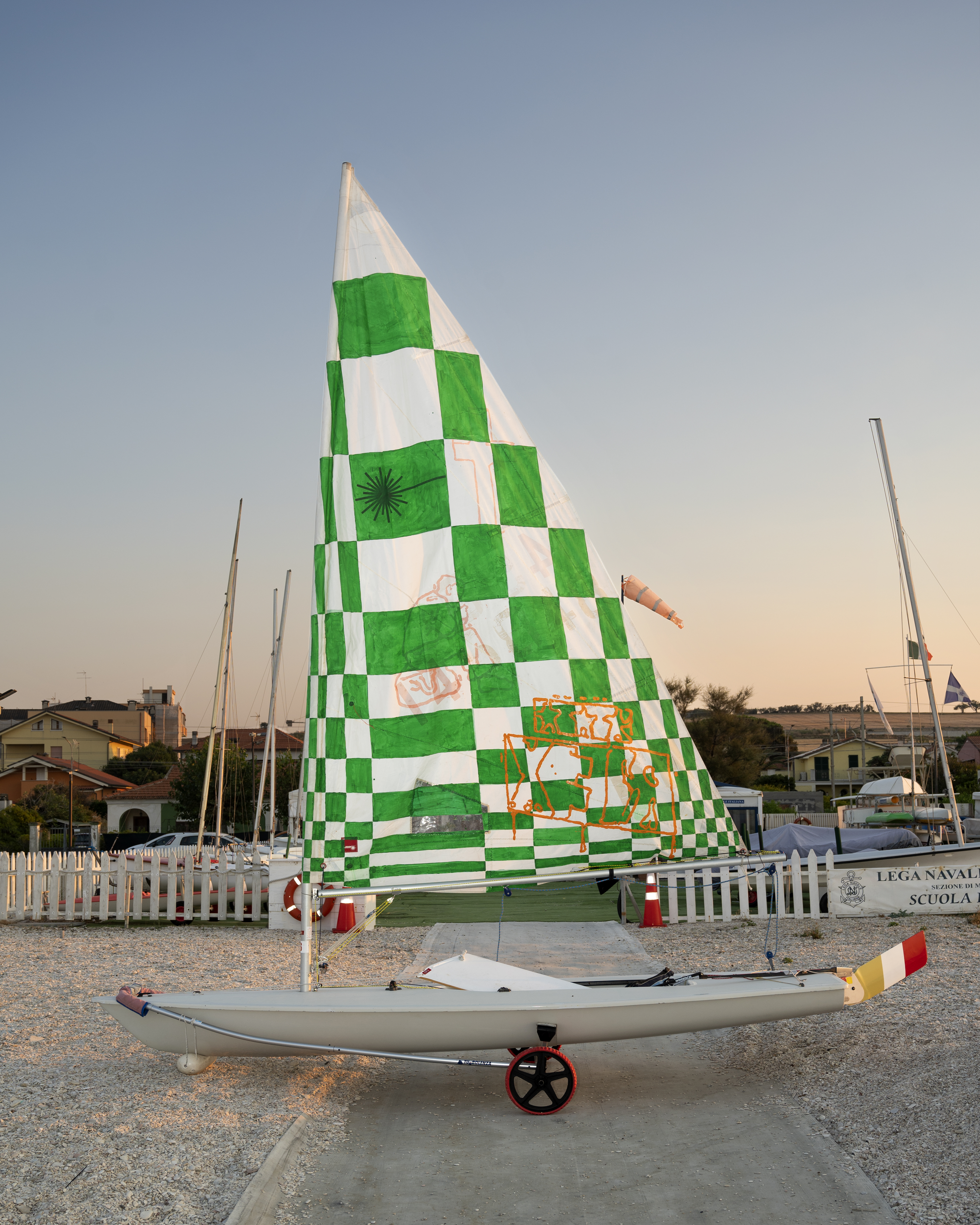 In MOVING SIGN, l’oggetto, a supporto del codice visivo non è più una boa, ma una piccola imbarcazione con una vela dipinta, con la deriva che si trasforma in segnale mobile in mare guidato dallo stesso artista. La vela sarà dipinta con un disegno optical che cita il “Dazzle Camouflage”, un genere di patterns che veniva dipinto sulle navi da guerra della Marina Militare Inglese e Americana durante la Prima Guerra Mondiale; lo scopo non era quello di nascondere, ma bensì di attirare e confondere l’osservatore.