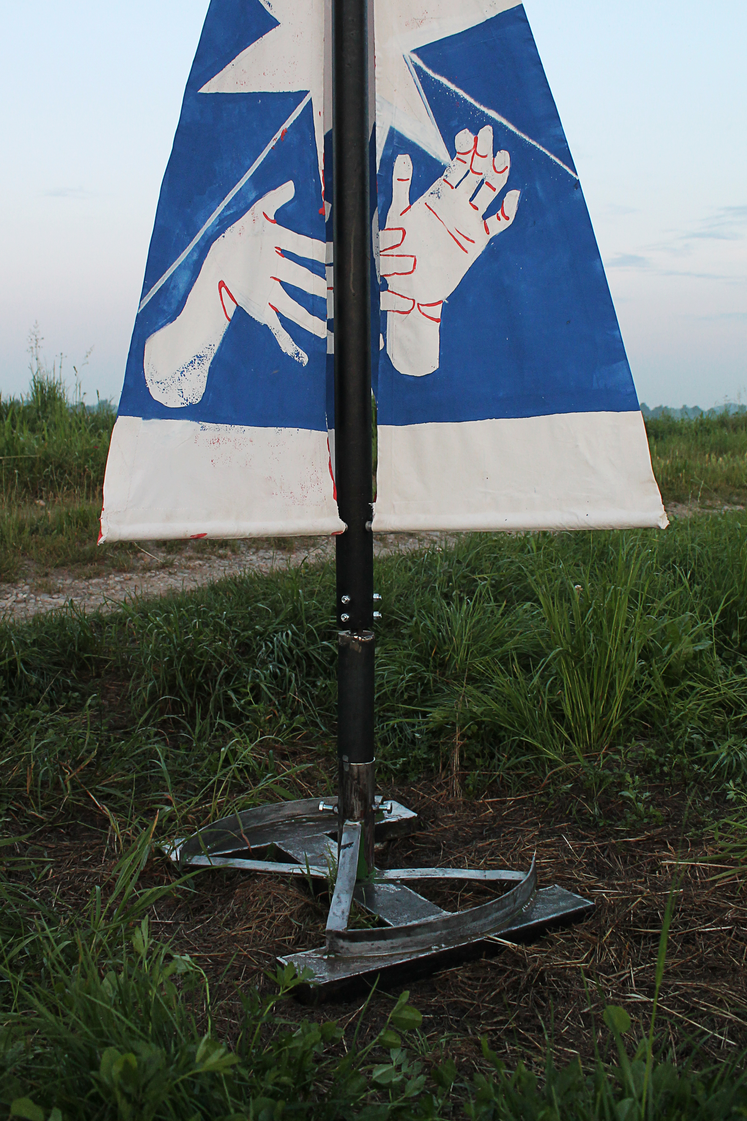 For the residence project in Spino d’Adda, the artist investigates a theme dear to him, the wind. The thrust of the air becomes a random input and activator of a dynamic sculptural object, which rotating on a central axis, starts an animation made of four frames. The hands represented on the four sails, in sign language mean wind.